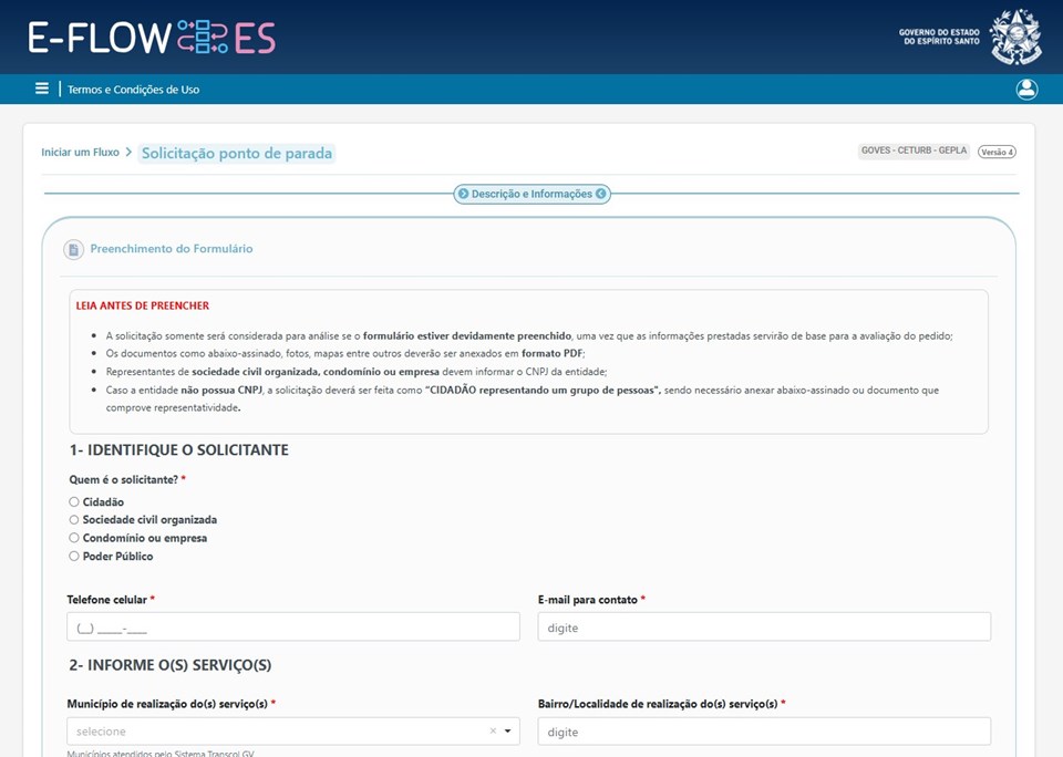 A ferramenta foi implantada na Gerência de Planejamento (Gepla) e abrange os três processos principais que estarão disponíveis para os usuários. Com a utilização do sistema E-Flow, essas solicitações passam a ser feitas exclusivamente pelo site da Ceturb-ES, na aba Serviços para o Sistema Transcol GV, no menu “Solicitações”: https://ceturb.es.gov.br/servicos-disponiveis-para-o-sistema-transcol-gv.