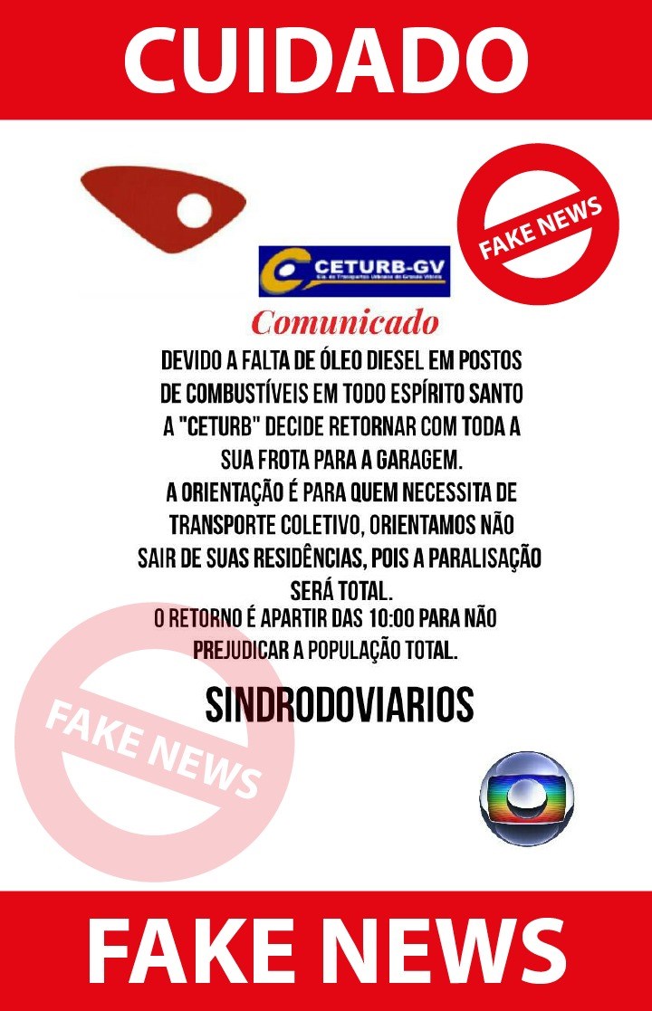 Está circulando nas redes sociais uma imagem com aviso informando sobre uma paralisação do transporte coletivo por conta da greve dos caminhoneiros, com uso indevido da logomarca antiga da Ceturb-ES. A associação da Ceturb à referida notícia é falsa, uma vez que a Companhia não compactua com esse tipo de ação e repudia a veiculação ao mesmo tempo em que tomará as medidas legais cabíveis para punir os responsáveis pela disseminação da notícia.
