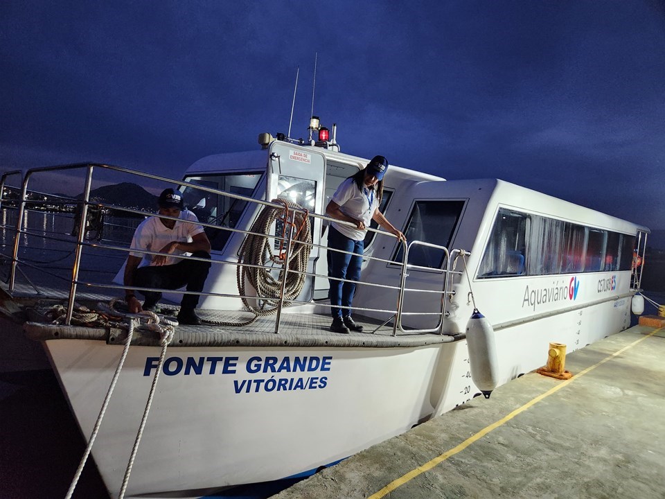 O governador do Estado, Renato Casagrande, anunciou o início das viagens noturnas do Aquaviário, programadas para terem início na próxima segunda-feira (15). O anúncio aconteceu a bordo da terceira embarcação adquirida pelo Governo do Estado para integrar o sistema Aquaviário, a Fonte Grande, em uma viagem de teste, realizada na noite desta terça-feira (09), na baía de Vitória.