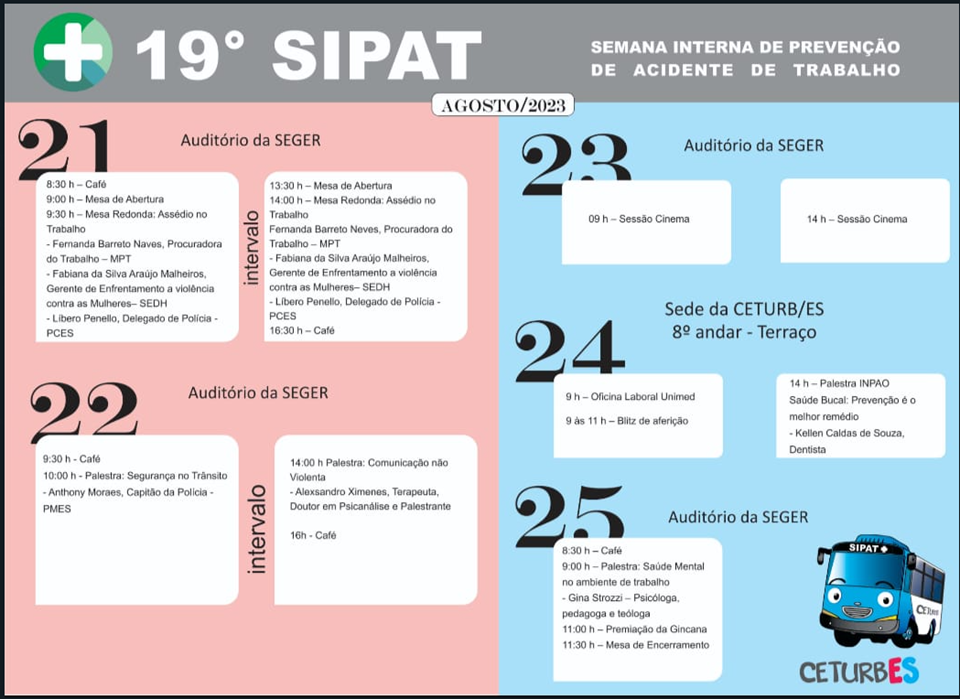 A Ceturb-ES promove, entre os dias 21 e 25 de agosto, a 19° Semana Interna de Prevenção de Acidente e Assédio no Trabalho (SIPAT) da Ceturb-ES, no auditório da Secretaria de Gestão e Recursos Humanos (Seger), no Centro de Vitória. Será uma semana de atividades voltadas para prevenção de acidentes de trabalho e doenças ocupacionais.