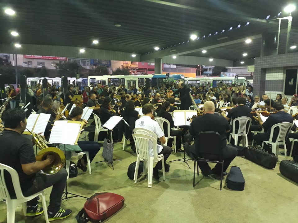 Na quarta-feira (06), a apresentação será no Terminal Laranjeiras. A orquestra conta com 80 músicos. O projeto, destinado às diversas faixas etárias, está fazendo sucesso nas praças, quadras, centros comunitários e parques, e agora vai encantar também os usuários dos terminais. Um dos objetivos é levar a música clássica a ambientes que escapam do tradicional. O evento é gratuito e as apresentações serão acústicas. De acordo com a Secretaria de Estado da Cultura (Secult), que promove a ação, cerca de 200 pessoas assistem a cada apresentação que, neste ano, estão sendo realizadas desde junho.