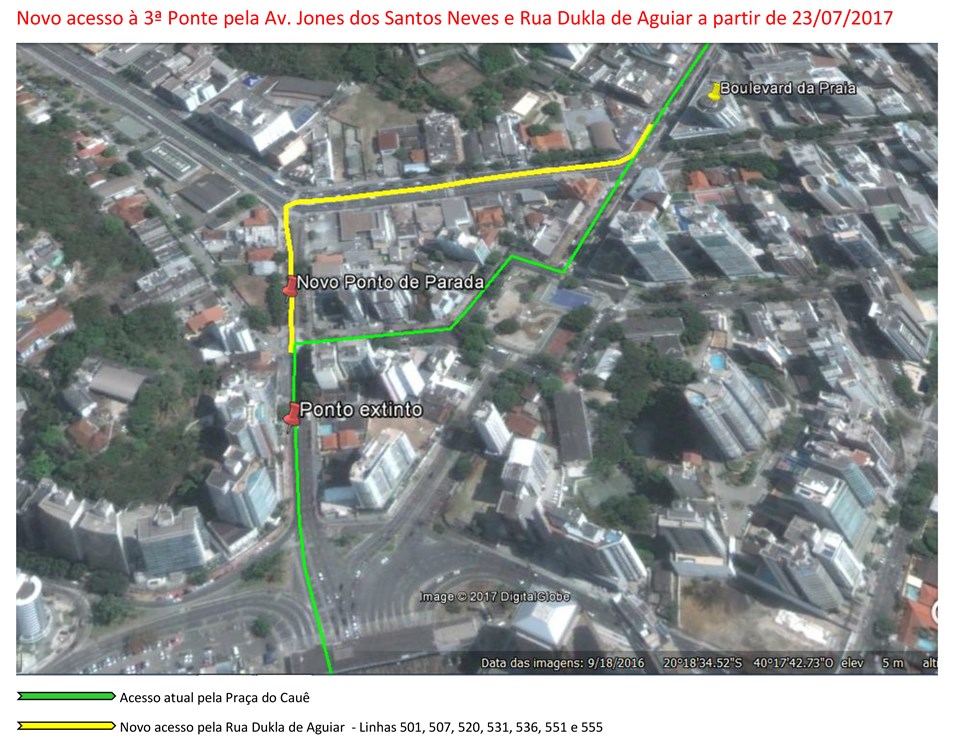 Os usuários das linhas 501, 507, 520, 531, 536, 551 e 555 devem ficar atentos a partir deste domingo (23), pois haverá mudança de itinerário para o acesso à Terceira Ponte, em Vitória. Essas linhas, provenientes da Avenida Nossa Senhora da Penha, deverão passar pela Av. Desembargador Santos Neves e pela Rua Dukla de Aguiar e não mais pela Praça do Cauê. O acesso será exclusivo para ônibus e o ponto de parada existente na Rua Dukla de Aguiar será recuado para facilitar a circulação na via.
