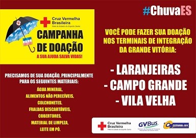 A partir desta quinta-feira (26), até o próximo dia 02 de janeiro, os terminais de integração do Transcol de Vila Velha, Laranjeiras e Campo Grande estarão recebendo doações para as vítimas das chuvas no Espírito Santo. Um ônibus será colocado em cada um dos terminais citados, onde o material recebido será armazenado para, ao final do dia, ser levado ao ponto de distribuição da Cruz Vermelha Estadual, localizado na Universidade Federal do Espírito Santo (Ufes).