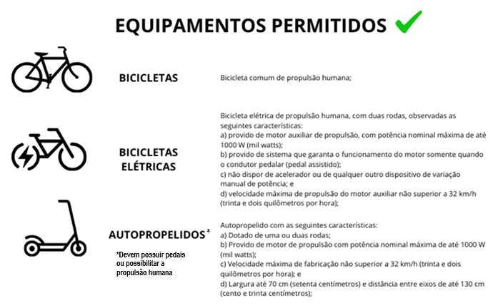 Para fins de conhecimento, apresentamos abaixo os equipamentos que possuem permissão de acesso à Ciclovia, levando-se em conta as características da via: