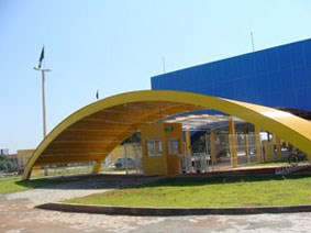 A cobertura utiliza telhas autoportantes, que permitem grandes vãos e eliminam a necessidade de estruturas intermediárias de apoio. Em toda a fachada foram aplicadas chapas de alumínio alubond, uma moderna tecnologia que associa resistência e leveza. O fechamento lateral das marquises foi feito com brises metálicos, que favorecem a ventilação e a incidência de luz, contribuindo com a redução do consumo energético.
